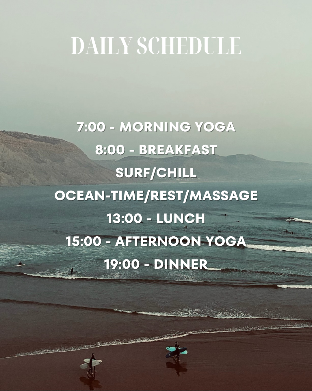 The mornings start gently with yoga, allowing the body to wake up, breathe, and move with intention. After, we invite you for a delicious brunch with local products.Later, there is time to surf, walk along the beach, rest, read, or simply do nothing at all. Afternoons unfold slowly, shaped by ocean time, relaxed meals, and moments of stillness. As the light softens, a second yoga or pilates session brings the body back into balance, releasing tension and restoring energy. No pressure. Just space to unwind.